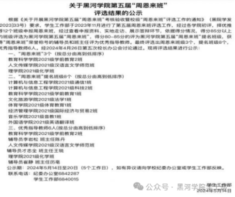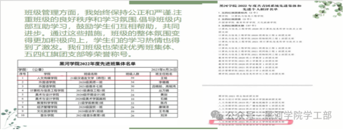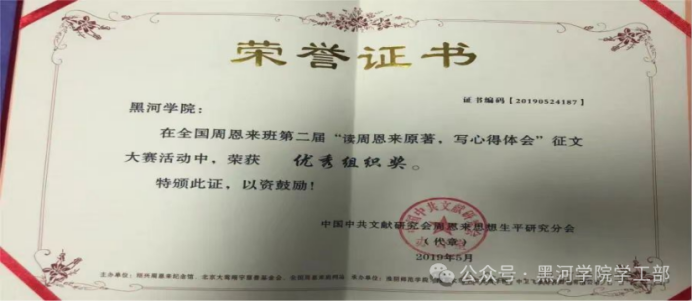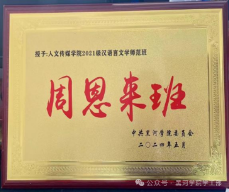 在“周恩来班”的建设过程中,班级同学参加各类志愿服务活动达五十余场,累计志愿服务表彰二十余项。同学们走进敬老院、黑河市第二福利院、花园社区等地,开展了关爱老人、帮扶儿童等系列志愿服务活动,志愿者们用行动诠释周恩来崇高精神风范带给他们的改变,努力做一个有担当、能作为的青年大学生。其中王佳慧和谢博文多次获得“优秀志愿者”称号,刘洋个人志愿时长超一百小时。同学们还共同设计布置了周恩来班最美教室,全班同学也以八万字的汇报交上了一份最好的答卷,通过周恩来班的建设切实增强了班级凝聚力。2024年5月,被学校授予第五届周恩来班荣誉称号。接下来2021级汉语言文学师范班将继续传承伟人精神,团结奋进,不断超越。